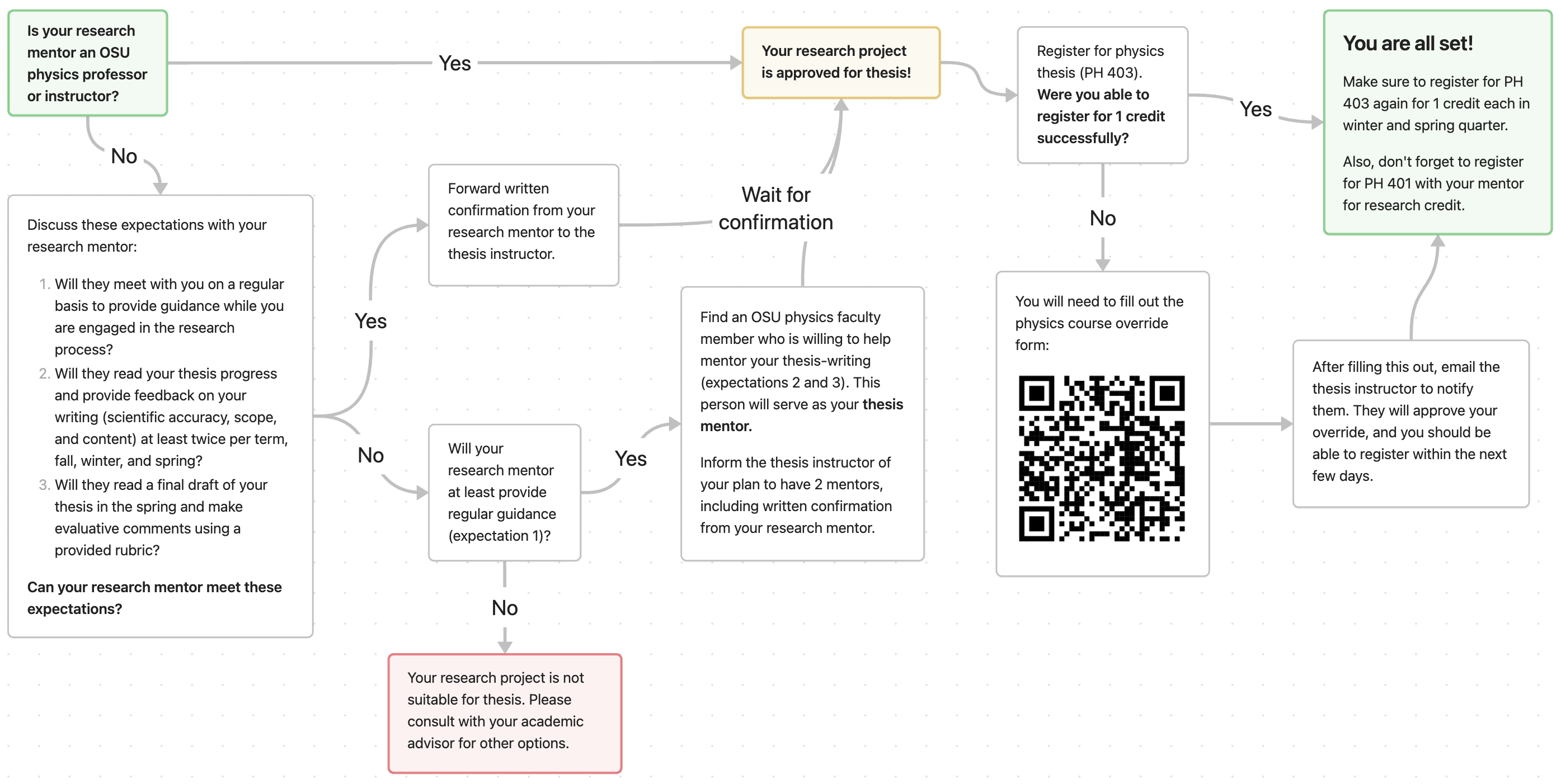 I also get many questions about the eligibility, expectations, and approval of thesis research mentors who aren’t in the OSU physics. These questions can usually be answered using this thesis registration flowchart.